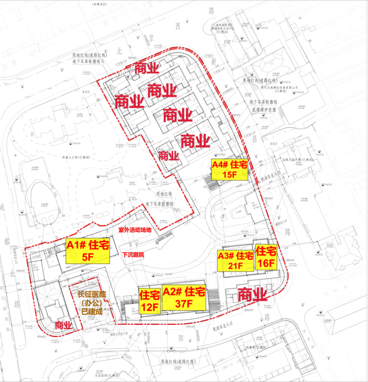 地块为住宅和商业混合用地,住宅方面,A1#5层住宅,A2#12层/37层住宅,A3#21层/16层住宅,A4#15层住宅.