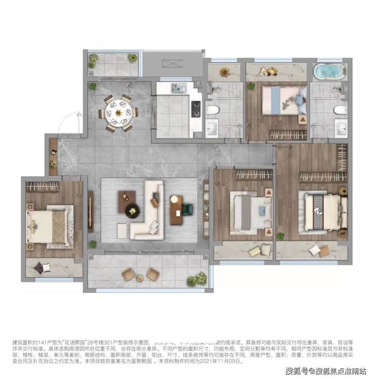 精装标准:洋房配备新风、地暖、中央空调,材质选用缅甸柚木实木复合板等