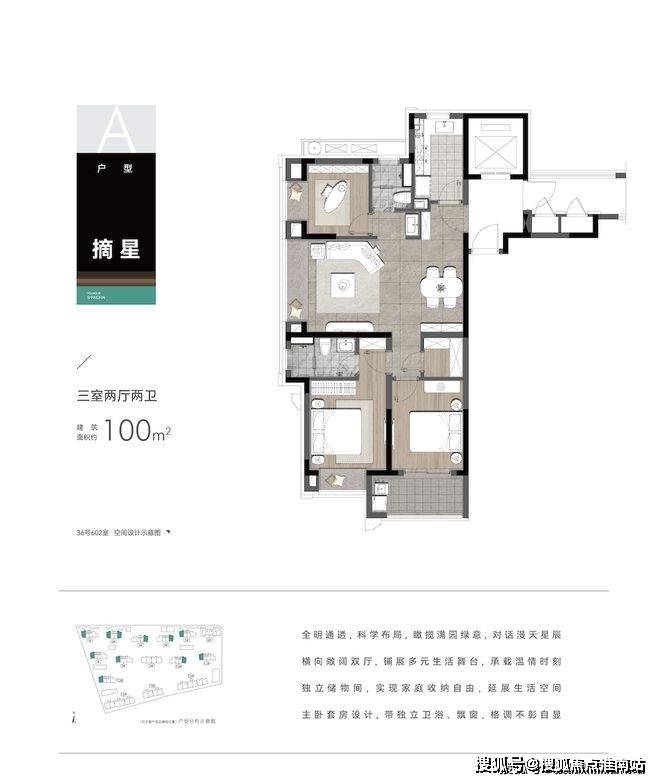 建面约100平3房户型,同样也是3种户型可选,中间套户型为3开间朝南,搭配U型厨房、双南向卧室飘窗设计、宽景阳台,为居者打造舒适的居家体验;边套户型则采用横厅+飘窗设计,坐在沙发上抬头即见窗外美景。值得一提的是南向次卧还搭配南向阳台,生活更为体面。还特别设置了一处收纳间,收纳生活的林林种种,如此体贴实属难得!