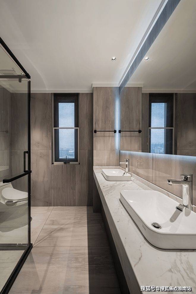 主卫因为空间足够大所以做了双台盆设计,有效提高生活效率。灯光细节设计为空间增色不少,整面镜搭配背光增加氛围感,搭配灰色系墙地砖,干净大气好打理。