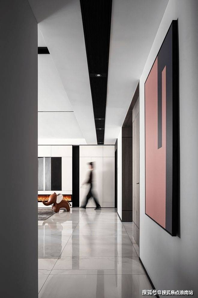 餐厅视**角尽头是中厨,利用了隐藏式推拉门设计阻挡了油烟,内部整体色调依然以黑白为主。过道墙壁精心设计为收纳空间,最大限度地利用了每一块空间增强收纳功能。**