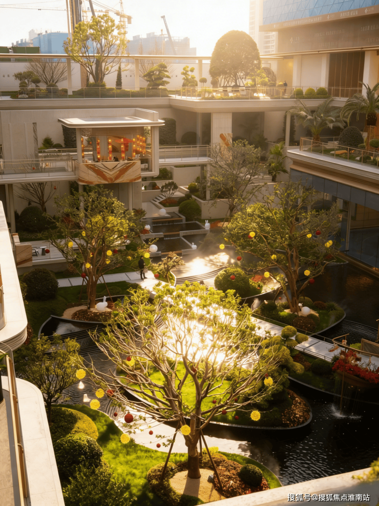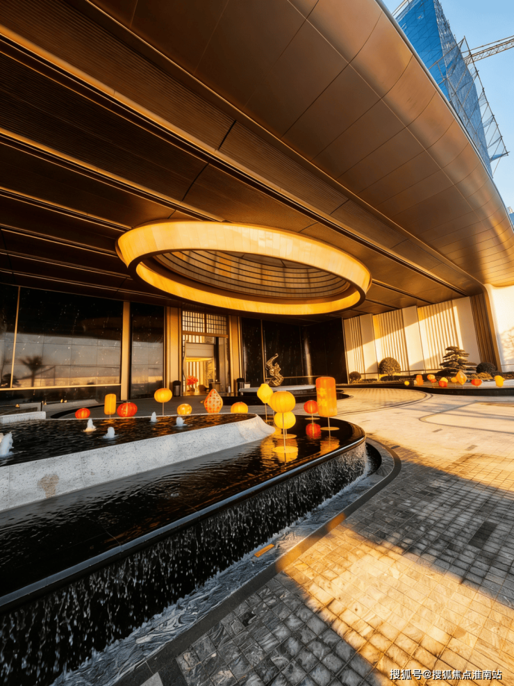 小区大门以“云扉初开”为灵感,打造具有仪式感的礼仪入口。宽约66米、高约8.6米的恢弘门庭,与酒店式归家大堂共同构筑,打造出极具仪式感的序厅,瞬间开启归家的尊崇心境。入口处精心打造的树阵水院,以静谧尊贵的氛围迎接归家。巧妙运用高差设计,通过层层递进的景观节点,优雅地引导业主步入社区深处。