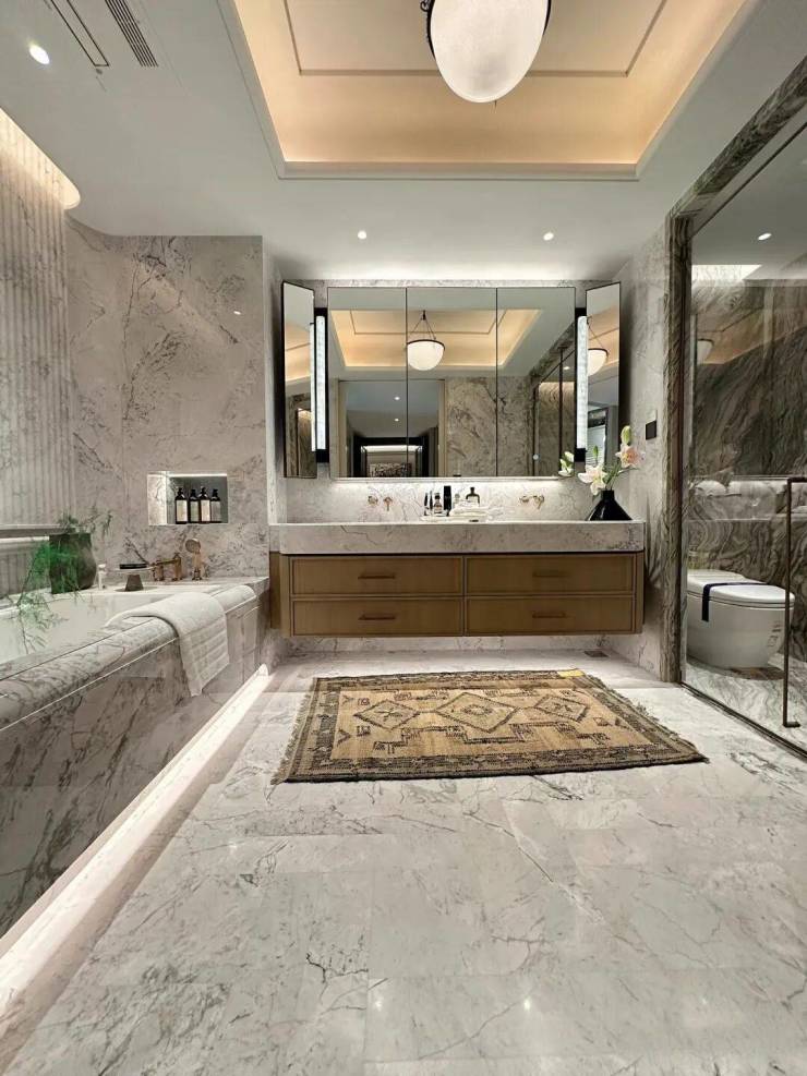 高端品质:由17家国际事务所联合设计,公区采用全进口石材铺设;室内配备嘉格纳四件套、劳芬卫浴等高端品牌洁具,装修标准对标豪宅水准。