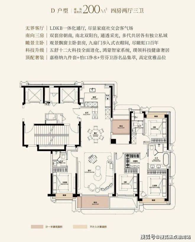 南向三房|双套房三卧室朝南,双联阳台,通透采光,多代共居各有独立私域