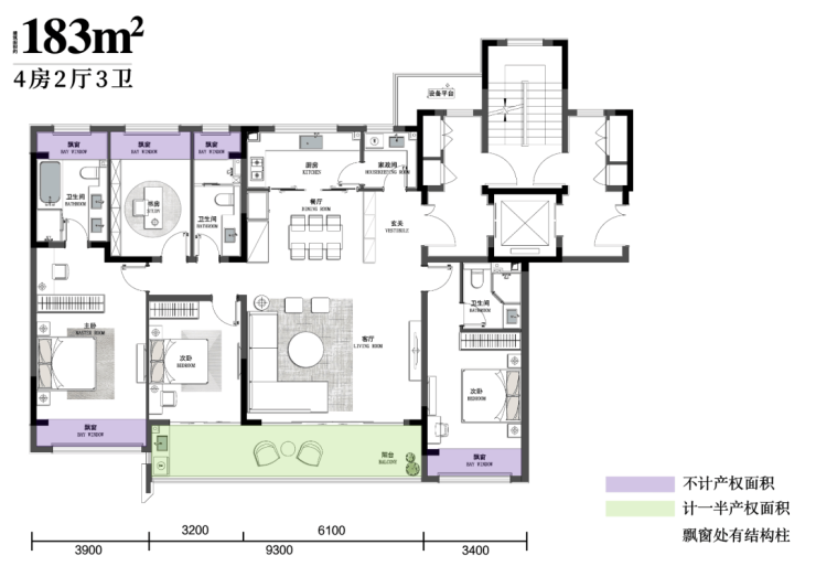 建面约183㎡户型,四房两厅三卫,设计加上各类赠送面积,得房率达到了惊人的超90%!南向约16.6米面宽,配合双联宽景阳台,推窗就是满园盛景。