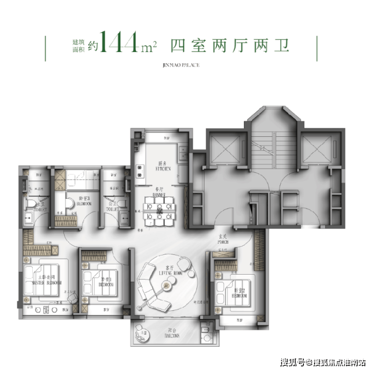 144㎡户型 更是将品质生活展现得淋漓尽致, 类一梯一户设计,电梯厅私有化 ,出入更加便捷私密;