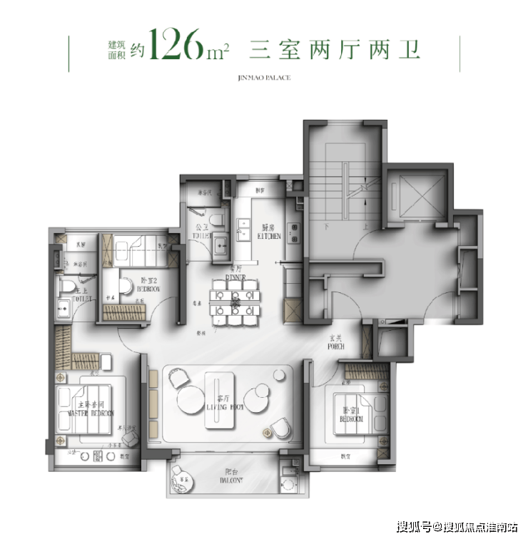 All three unit types are airplane-style, with north-south ventilation. The rooms are placed on both sides of the living room without disturbing each other. Among them, the floor area is approximately 126 square meters, with a horizontal living room of about 5.9 meters.
