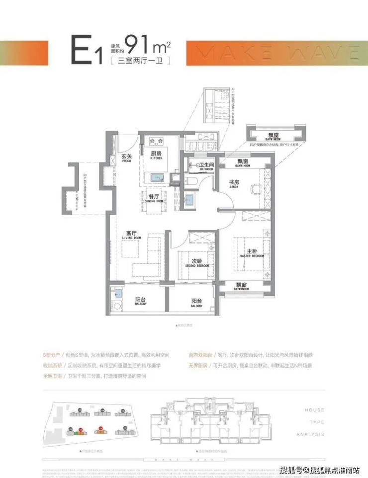 91㎡三房:南向双阳台 + 南北双飘窗,得房率高,动线合理,适合首次置业家庭