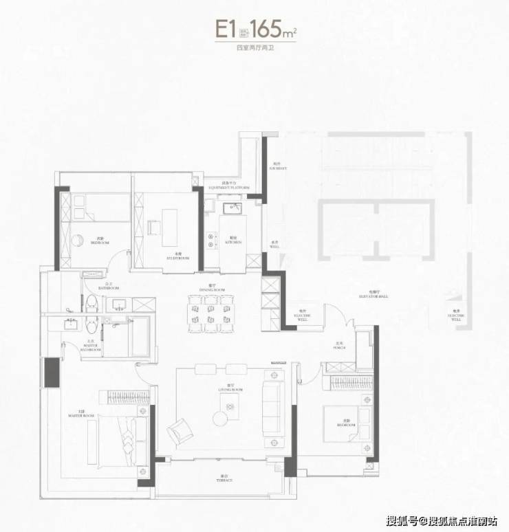 188户型2梯2户,有独立的电梯厅。4房3卫设计,还是3明卫,这两点还是不错的。