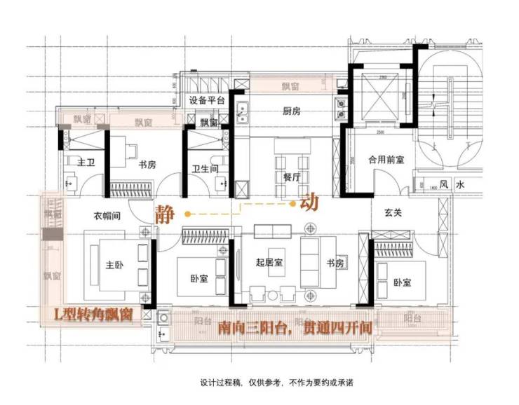 在面宽尺度上,建面约140㎡户型也是超越以往设计,南向面宽做到了约15.6米!不仅营造超长的采光面和极致的视野,更配合L型转角飘窗,打开广角视野,躺在床上也能欣赏城市和小区园林美景,营造全景舱视野。