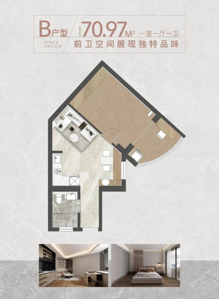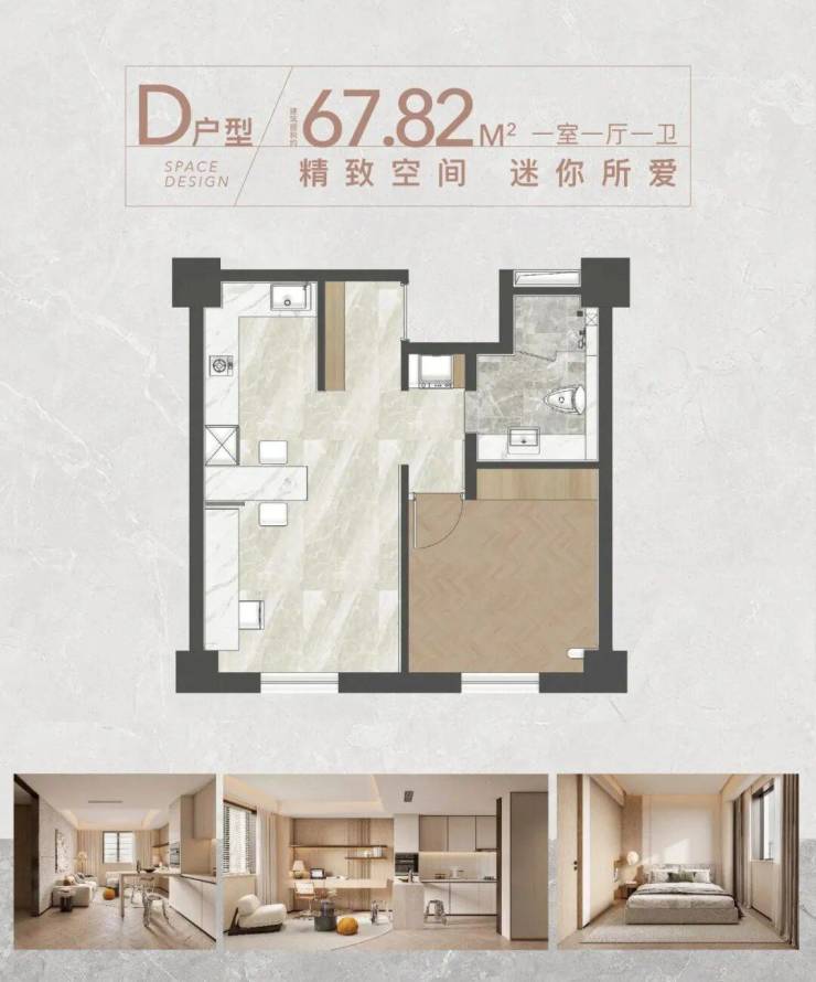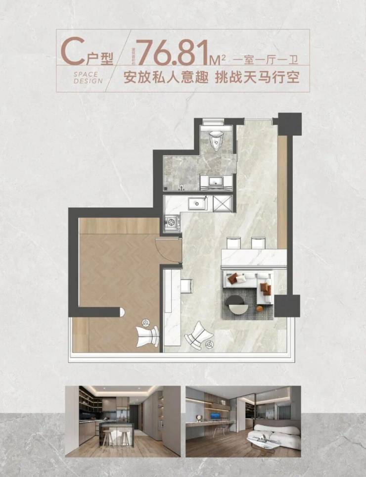 在售户型:68-198㎡1-3房,主力户型68-77㎡1房、128㎡2房、198㎡3房,得房率约75%(部分房源超100%得房率)