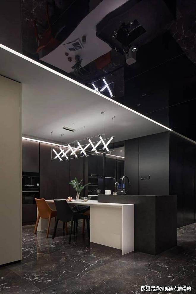 与客厅相比,餐厅对黑色的运用更为多元.设计师巧妙地运用不同材质,吊灯与精致器皿相得益彰,一幅城市墨画定格了时间,伴随着富有格调的三餐四季.