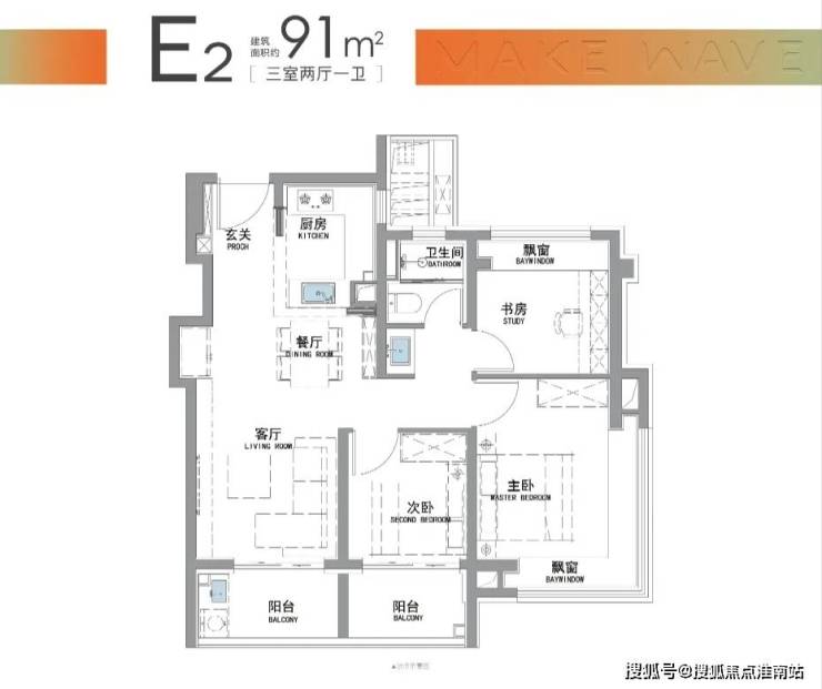 而招商·时代潮派|东屿此次建面约91㎡户型,就做出来了比市面百平户型更好的的“南向双阳台+南北双飘窗”设计。