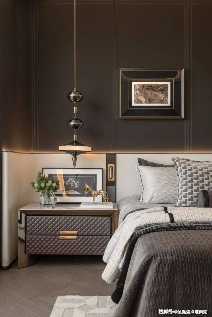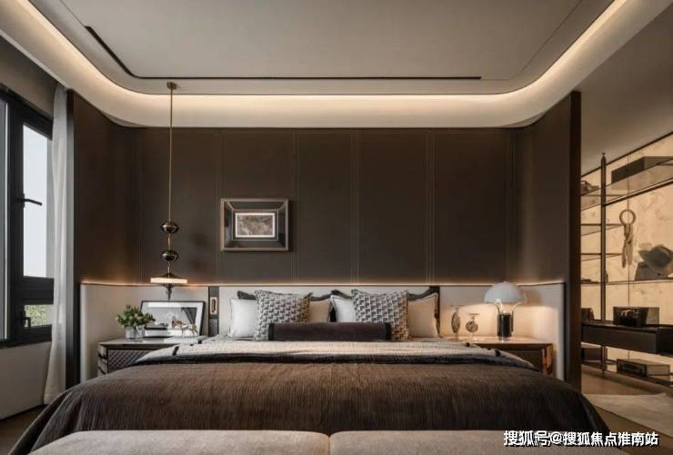 主卧套房超40㎡的奢阔尺度,可营造一个极致享受的卧室。背景墙以围合式造型构成亲密的包裹感,为休憩空间创造细腻温和的氛围。
