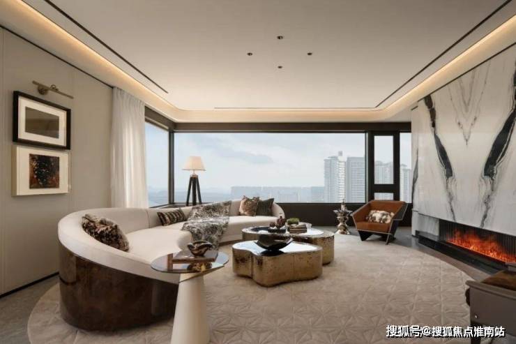 客厅的弧形沙发在开放式的大厅内自然地围塑出休闲区,视野开阔,活动自如。