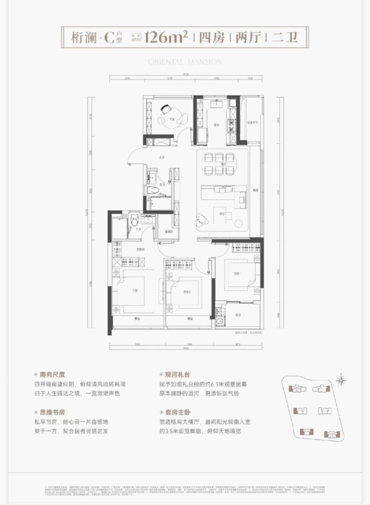 建面约126平米户型,四开间朝南的尊崇布局,主卧配3.5米宽景飘窗,更享6.1米观景宽幕,让您的家成为“运河头排观景席”。运河船只穿行,每一刻都是永恒的风景画卷。