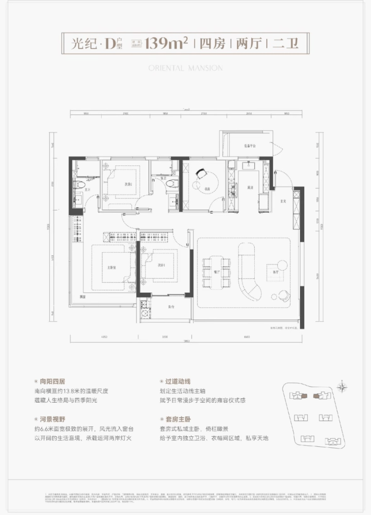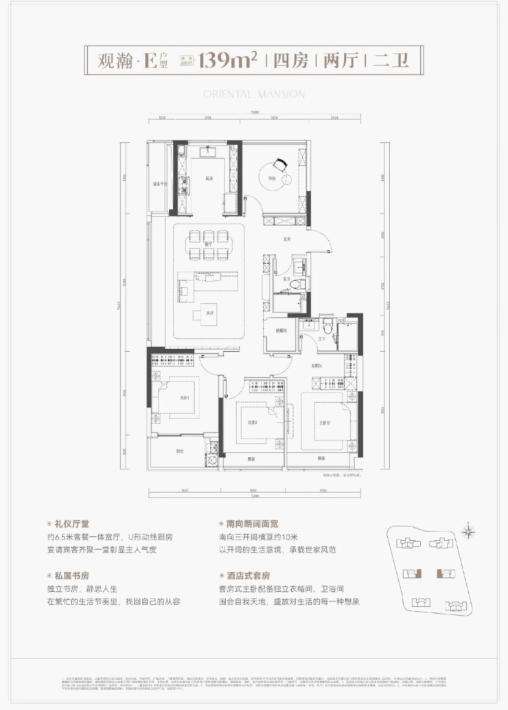 139平米“竖版”户型,得房率高达约93%,空间利用率卓越; 南向三卧设计,采光充沛,完美适配二胎及三代同堂家庭需求; 客厅面积约37平,开阔大气,并配备约2.6平独立储物间,实用性强。