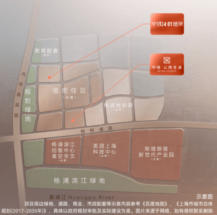 块属于杨浦滨江“九宫格”之一,紧邻内环高架、12号线宁国路站,直线距离滨江约700米。地块北面是一所九年一贯制学校,南侧是中建壹品·外滩元境;周边还有已经售罄的海玥外滩序BUND98、中建壹品·浦江之星项目。