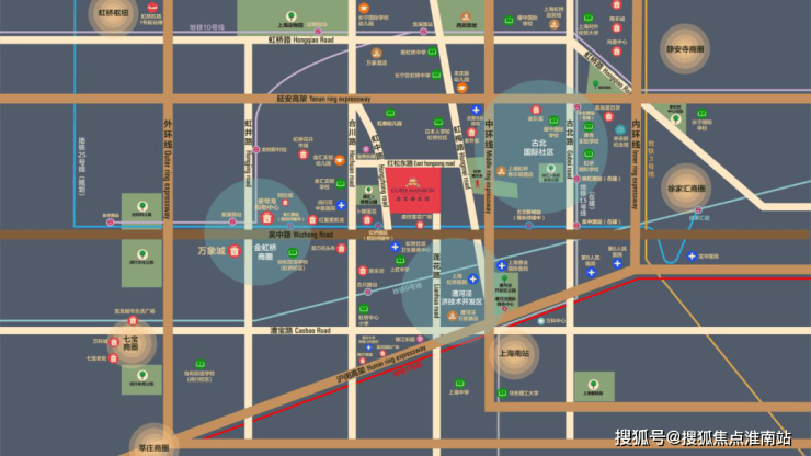 交通配套方面:项目地处长宁、徐汇、闵行三区交汇的金虹桥板块的核心区位,拥有多维立体的交通,延安高架、中环线、外环线环伺。