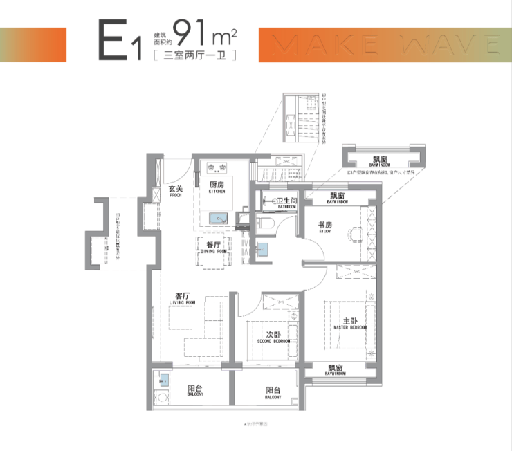 “南向双阳台+南北双飘窗”,构筑真3房户型!
