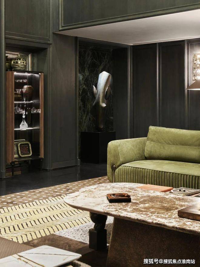 弘安里售楼处电话:400-8818-994✔✔│弘安里官方售楼处地址发布:上海虹口北外滩弘安里官方售楼处电话400-8818-994客厅整体面宽达9米,亮色装饰线条的深绿色墙面还原海派建筑风华,也彰显传承之意;La Greca模块化主沙发由意大利顶级奢侈家居品牌VERSACE出品,自由子和的茶几组合一款由艺术家雕刻出花叶后固化封脂而成,另一款则采用意大利翡翠玉打造,散发着低调奢华的艺术格调。