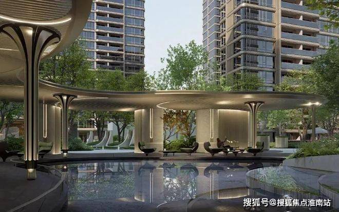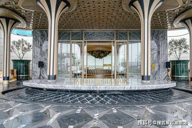 大门口的水景采用了龙鳞水纹的造型。在现场,会有种身处顶奢酒店入户大堂的观感。