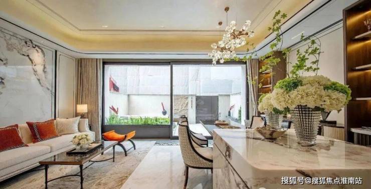 得益于大面宽,该户型客餐厅横厅布局,这在风貌界不多见,客厅整体面宽达6.5米(K户型面宽约8.7米),再加上一层约3.4米层高及南向采用大面积落地玻璃,客厅通透明亮。