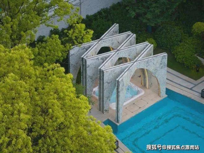 Beneaththeembraceofpergolasandfoliage,ThegeometricsapphirepoolAchieveseternalserenity,Itstranslucentwatersmirroringcloudsandsky.