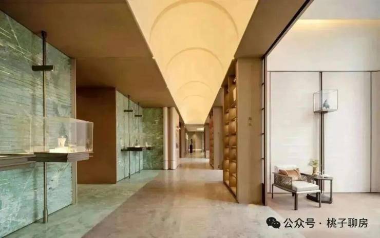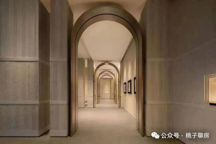 内外双重门厅景墙运用了约1000方顶奢才会用上的月光米黄石材,还是更费料的弧形石材,搭配香槟金线条,与爱马仕全球旗舰店的双曲面叠墙造景手法如出一辙。