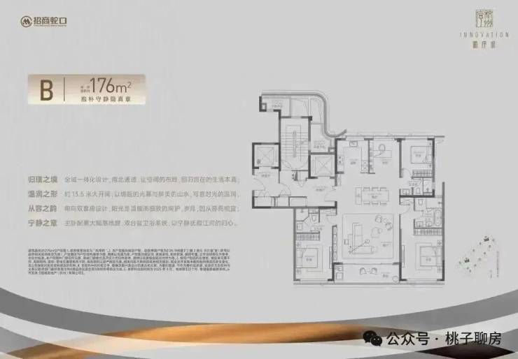 建面约 176㎡:4 房 2 厅 3 卫,尺度更奢阔,主卧套房带独立衣帽间与书房