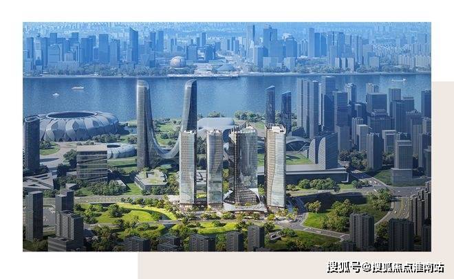 整个建筑群的布局沿着奔竞大道展开,由四栋塔楼和附属的酒店配套裙房共同组成。这个 26 万平方米的综合体项目,由七位行业大师联袂打造,其设计的核心理念是将国际化大师的智慧结晶、艺术性生活表达和杭州本土文化的融合,创新出一个独一无二的“城市会客厅”。
