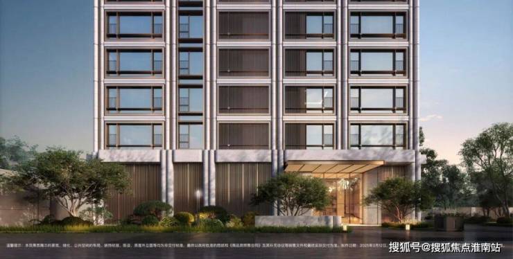 外立面采用沙漠风与白海棠石材,曲线纹理设计,点缀金属线条,大面积玻璃提高整体窗墙比。