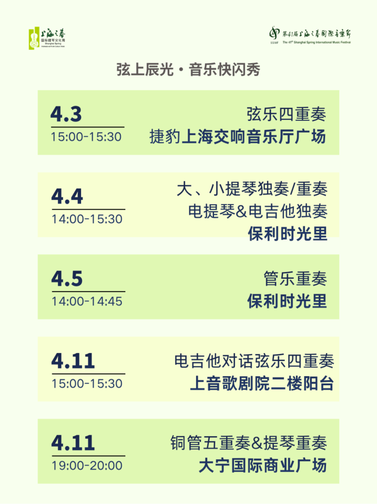打造多场“弦上辰光”音乐快闪秀,从捷豹上海交响音乐厅、上音歌剧院,到保利时光里、大宁国际商业广场等城市地标,提琴重奏、管弦乐重奏等演绎轮番上演,让市民在街头巷尾邂逅惊喜弦音,奏响“全城乐动、全民共享”的春日交响。