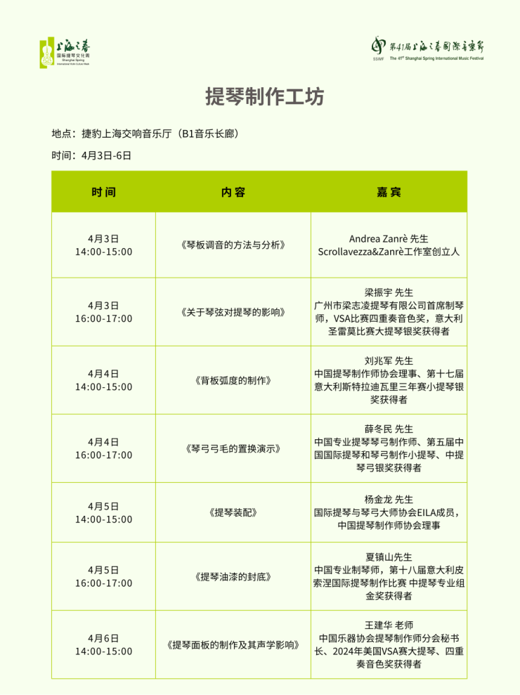 著名小提琴家林朝阳、李沛、王之炅、刘霄,提琴制作大师郑荃、华天礽、斯蒂芬·冯·巴伦(Stephan von Baehr)等名家大咖,将带来演奏、教学、鉴赏、制作、收藏等丰富内容,兼顾专业深度与大众普及,适配专业乐手、音乐院校学生、音乐学习家庭、古典乐爱好者等不同受众需求。