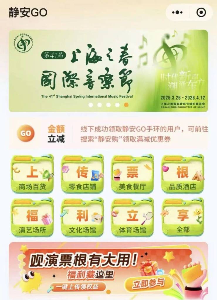 以“票根经济”为抓手,深化文旅商体展联动,激活城市消费活力。我们推出“票根联动·潮涌静安”示范项目:以上海之春国际音乐节全市范围内的演出票根为“福利通行证”,精准引流全市乐迷至静安区,在“静安GO”文商旅体联动平台票根经济专区解锁静安全域超百家商户、多家场馆的多重优惠,实现一张票根玩转静安的消费体验。