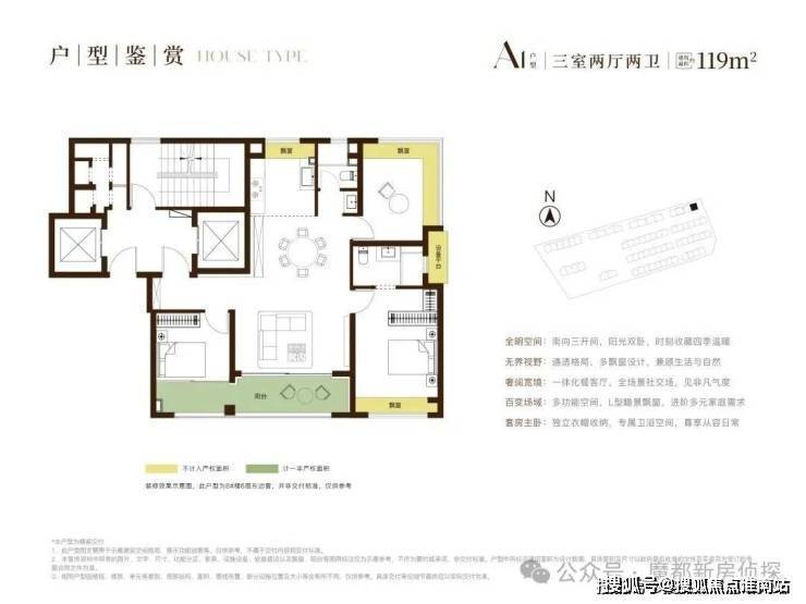 户型结构:主力户型(面积、居室数量)、布局设计(南北通透 / 动静分区)、得房率、赠送面积、飘窗 / 阳台配置