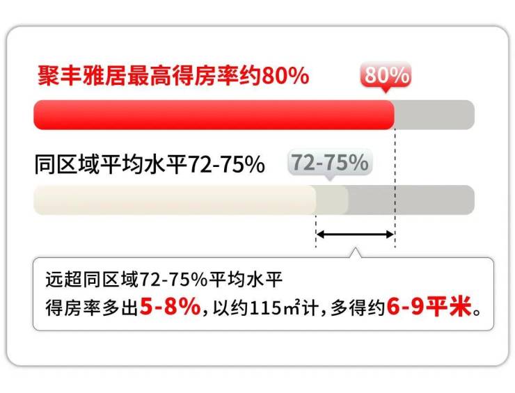 同级新房得房率普遍72-75%,聚丰雅居7层小高层为一梯两户设计,得房率高达约80%,18层高层得房率也达约76%。