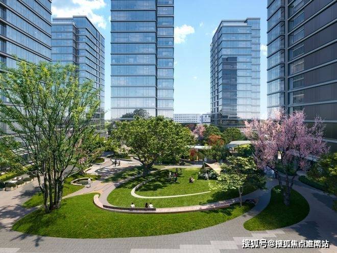 建筑布局:7栋“水晶天幕”楼宇采用围合式设计,最大楼间距63米,270°环幕视野。