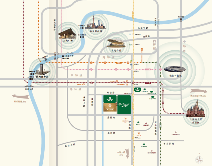 绿宝园位处康桥别墅区核心位置,距中环线仅约3.5 公里,紧邻S20, 紧邻地铁18号线康桥站。驾车可快速直达前滩、陆家嘴、张江,与迪士尼、外高桥、临港自贸区等浦东主要CBD。