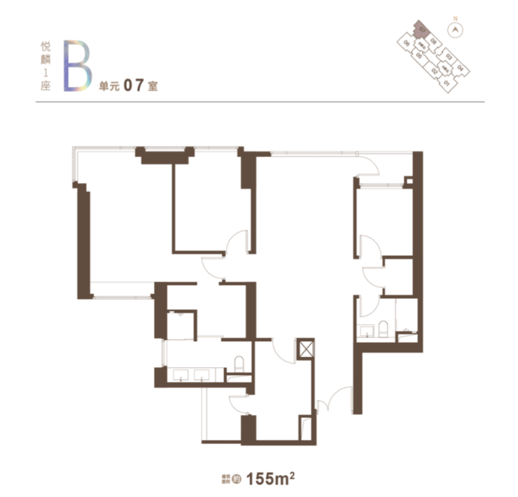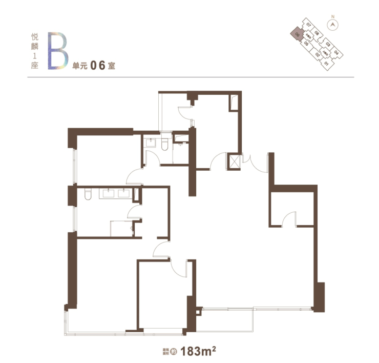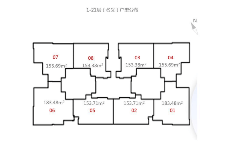 在售户型:151-183㎡行政公馆,三梯四户,得房率约77%