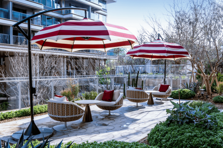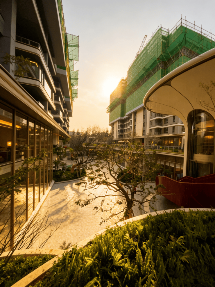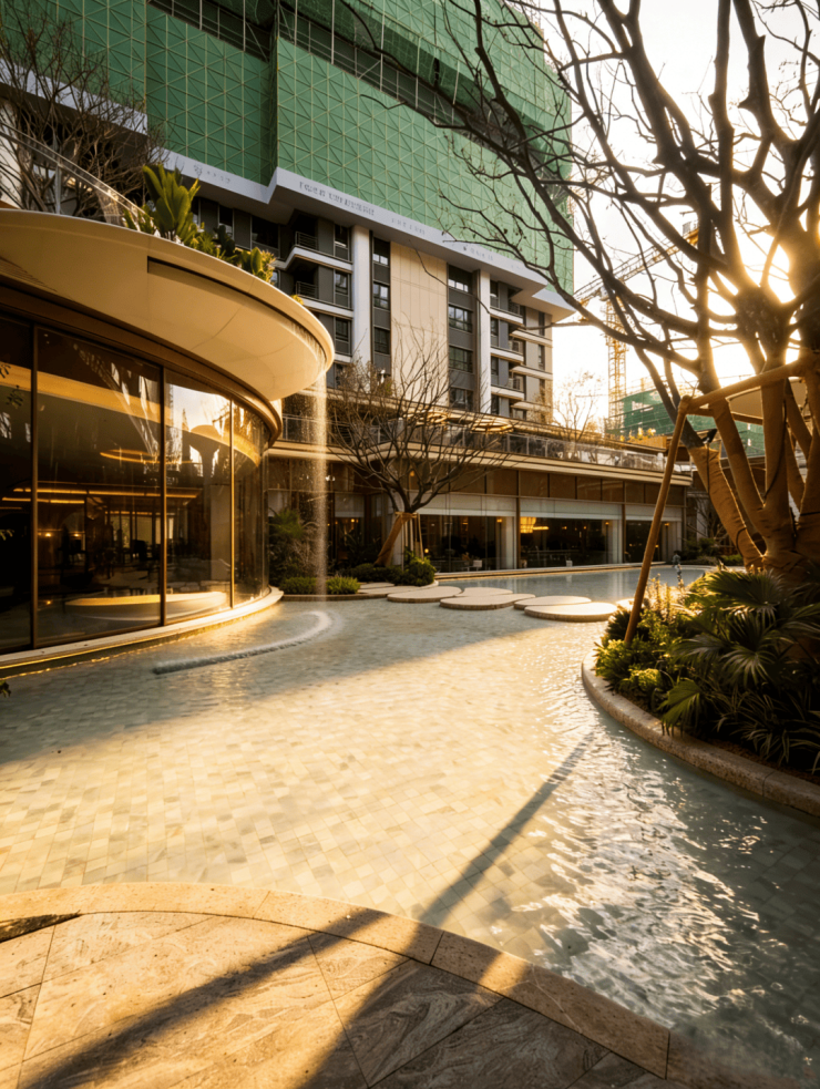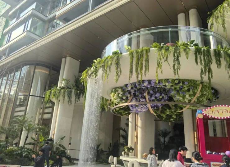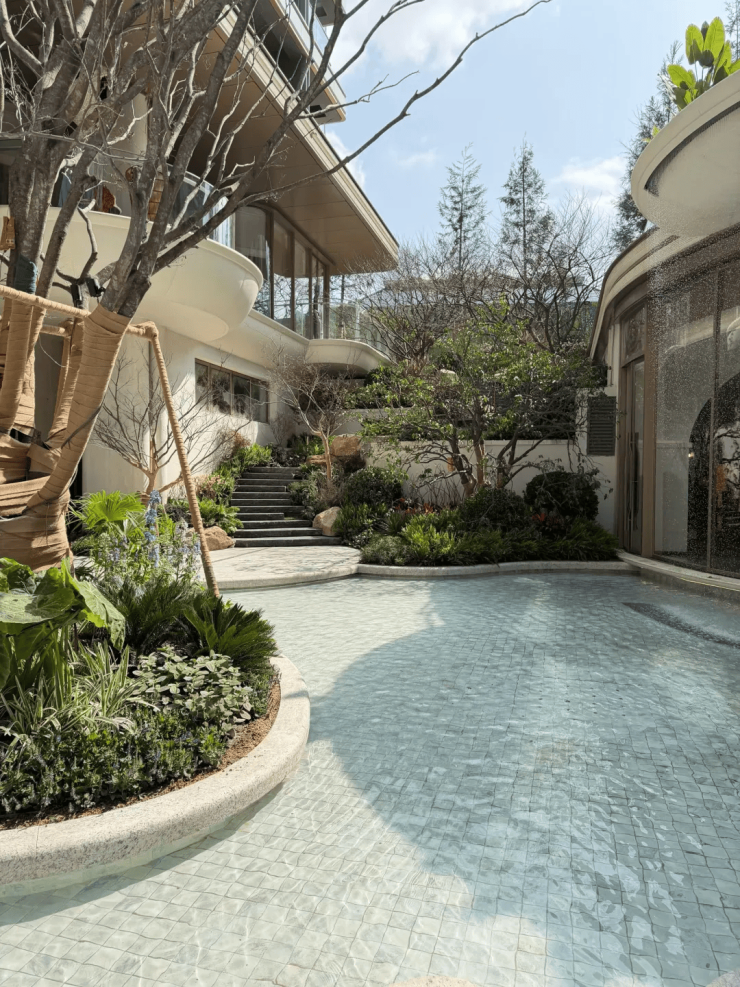 西派云间带来的,不只是一座下沉式庭院,而是一座立体悬浮的岛屿。沿着浮溪廊桥往里走,空间豁然开朗。约1600㎡的立体瀑布水院映入眼帘,三座瀑布以不同高度凌空飞落,水声潺潺,足以覆盖城市的喧嚣。脚下是约1200㎡的镜面水景,倒映着天光云影。为了还原自然意境,设计师跨省寻来两棵树龄超过50年的朴树(树王),静立水畔,营造出“瀑谷秘境”的震撼视觉。在这里,景观不再是仅供观赏的“背景板”,而是可步入、可停留、可沉浸的生活现场。
