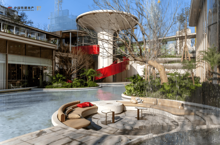 挑高约9米的双层书吧:一整面巨幕玻璃将水院景色框进室内,阳光穿过瀑布洒落书页,水声与翻书声轻轻应和。云间学堂与户外沙龙区:为孩子们提供席地而坐的阅读空间,也为社区音乐会随时上演提供舞台。此外,那座12米高的艺术水幕旋梯,堪称社区的“艺术坐标”,拾阶之间,光影流转,每一步都提醒你:生活,值得被认真对待