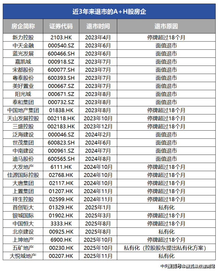 据中房网不完全统计,自2023年以来,A+H股至少已有28家上市房企退市,其中包含已经官宣私有化退市,尚待进一步行动的五矿地产。