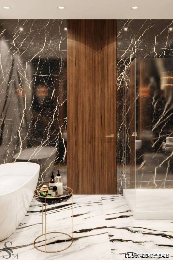 在STUDIA54的设计项目中,浴室特别引人注意。这个项目也不例外,双人洗手台,Eichholtz的灯和“Panda”的大理石,在逻辑上延续了公寓的主题。