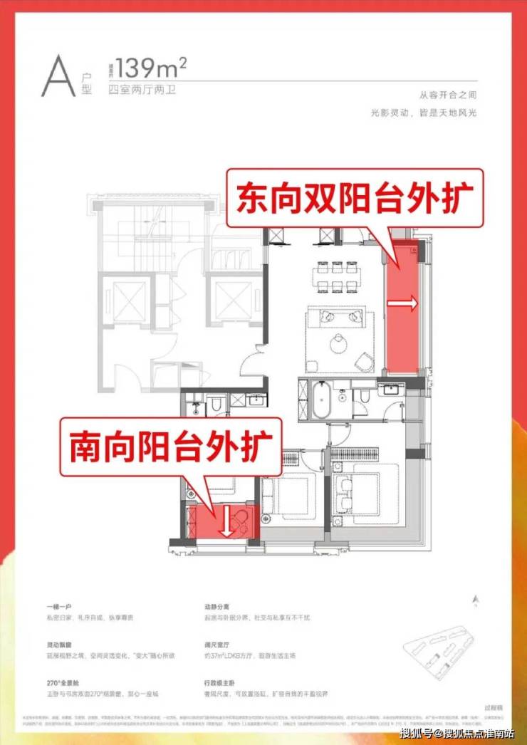 更大尺度的约139㎡4房,更是做到三阳台设计——超大观景阳台与约5.7米大横厅打通后,形成堪比150㎡户型的大方厅,家庭聚会、孩子嬉戏都有充足空间,南次卧同样可借阳台拓展,舒适度再升级。