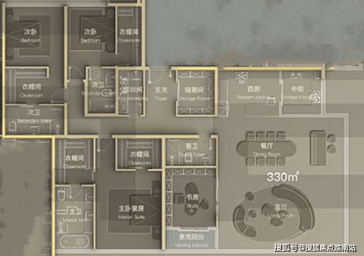 比如289㎡户型两个次卧尺度分别达4.3米*3.87米,3.8米*5.14米,并标配独立卫浴和收纳。