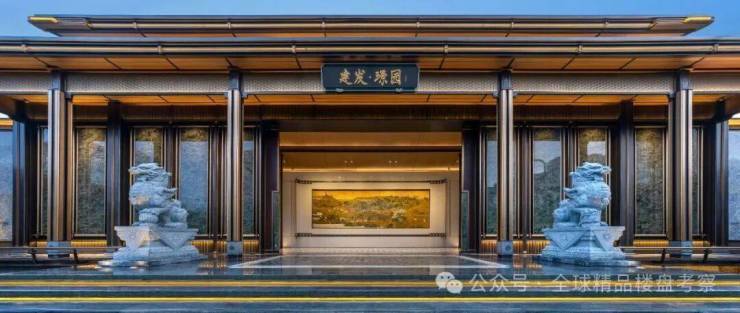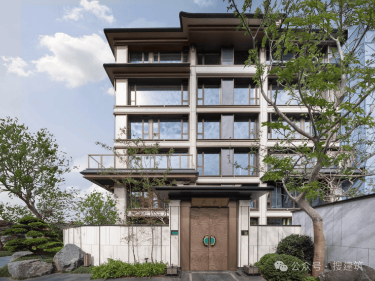 建发·璟园的立面设计,源自对宋式建筑体系的深度溯源。项目团队借鉴北宋壁画中的楼阁形象、兼取苏州现存建筑及园林中的楼阁元素,加以提取简化与演绎,形成“三阁并联”的立面语言。