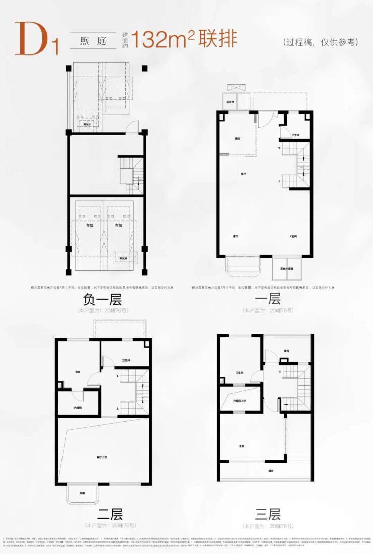 建面约132-195㎡联排别墅,一院一厅间的无界私院,拥有前庭后院+超大挑空+南北双星空露台+室内庭院等超享空间。