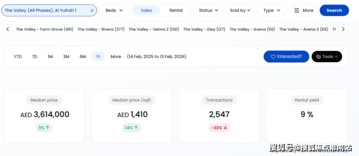 根据DXB(迪拜土地局)的数据可以看到,花溪谷近一年中每平方英尺中位价为1,410AED,同比涨幅达14%,中位总价为3,614,000AED,同比上涨9%,这充分证明了该片区的资产增值能力,花溪谷的租赁收益率稳定在9%,这一数据远超市场平均水平。尽管过去一年交易量同比下降33%,但价格仍保持上涨,这说明该片区的资产价值坚挺,属于“量跌价涨”的优质稀缺板块,买家对其价值高度认可。