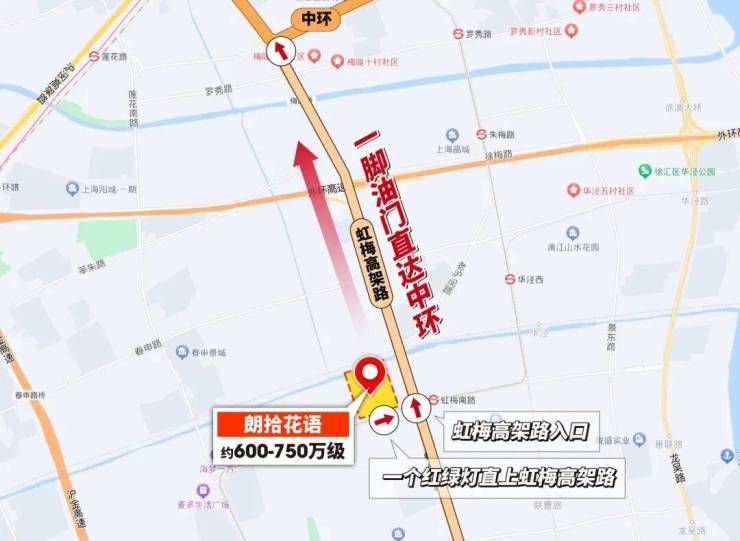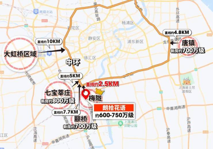 朗拾花语所在的梅陇板块距离中环线直线约2.8km,这一点比同级别的各板块都近,甚至比约800万级的莘庄七宝都近。